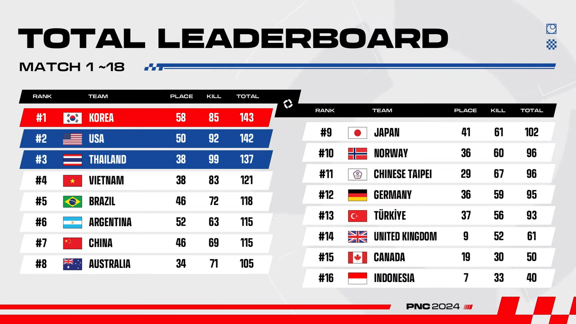 태국은 강한 화력과 집중력있는 교전을 선보이며 이번 대회를 3위로 마무리 하게 되었는데 많은 매치에서 이름이 불리고 교전상황마다 자신들이 취해야 할 이득을 착실하게 챙기며 킬점수를 100점가까이 획득하여 이번 대회에서 가장 많은 킬을 올린 팀이 되었습니다.